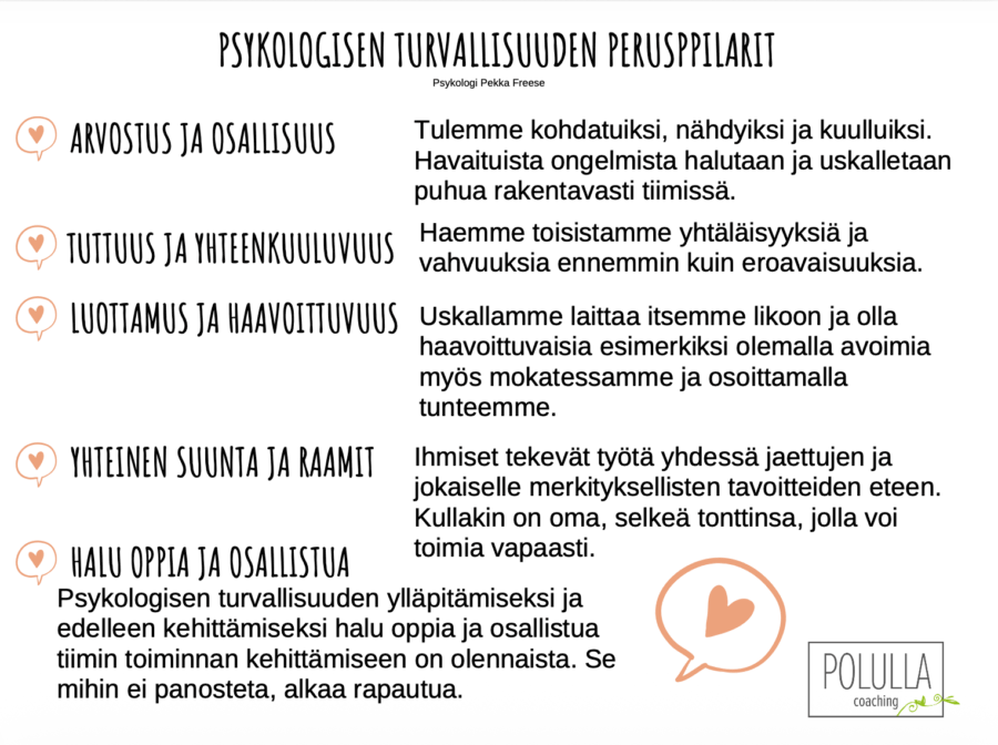 Polulla psykologisen turvallisuuden osatekijöitä tutkaillaan ja konkretisoidaan työnohjauksissa. Jokainen meistä on osasena rakentamassa ja ylläpitämässä työyhteisön psykologisen turvallisuuden peruspilareita .